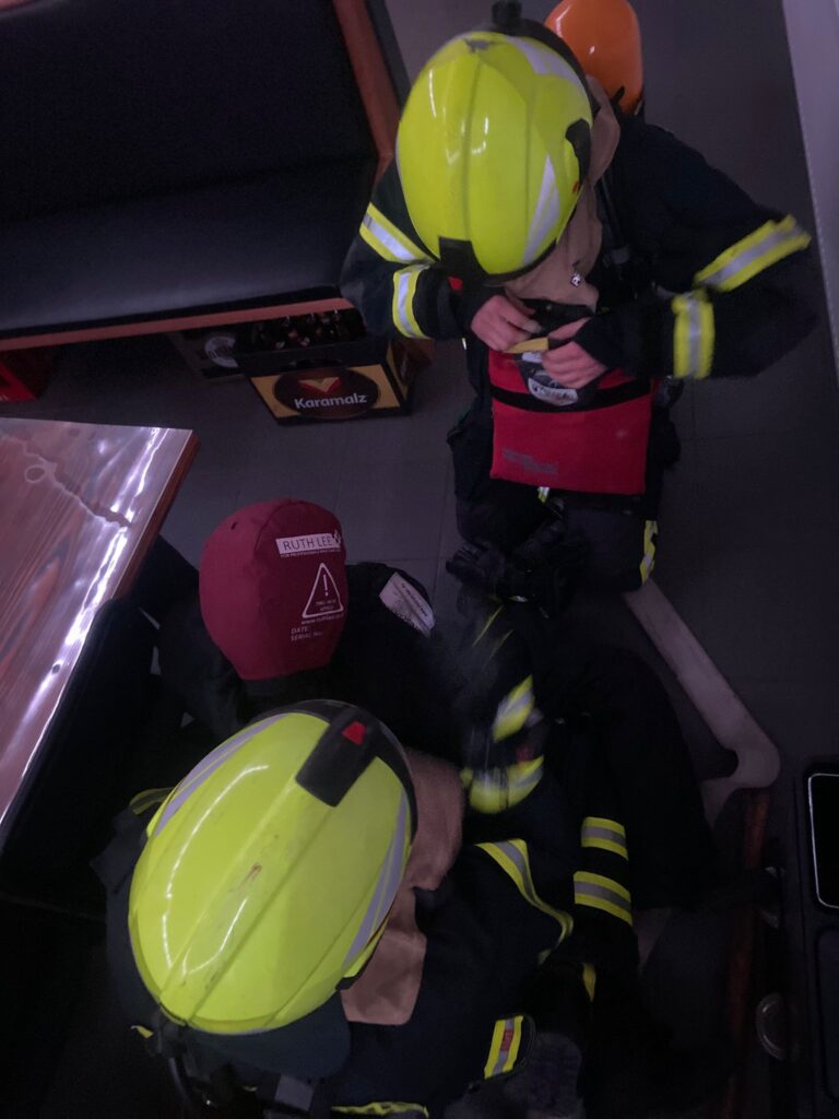 Die zweite Gruppe übte das Ausrüsten mit Atemschutz während der Fahrt im Löschfahrzeug unter Zeitdruck. Ziel dieser Übung war es, einsatzbereit zu sein, bevor die Einsatzstelle erreicht wird – selbstverständlich unter Beachtung aller Sicherheitsstandards. Hier standen Routine, Koordination und Teamarbeit im Fokus.