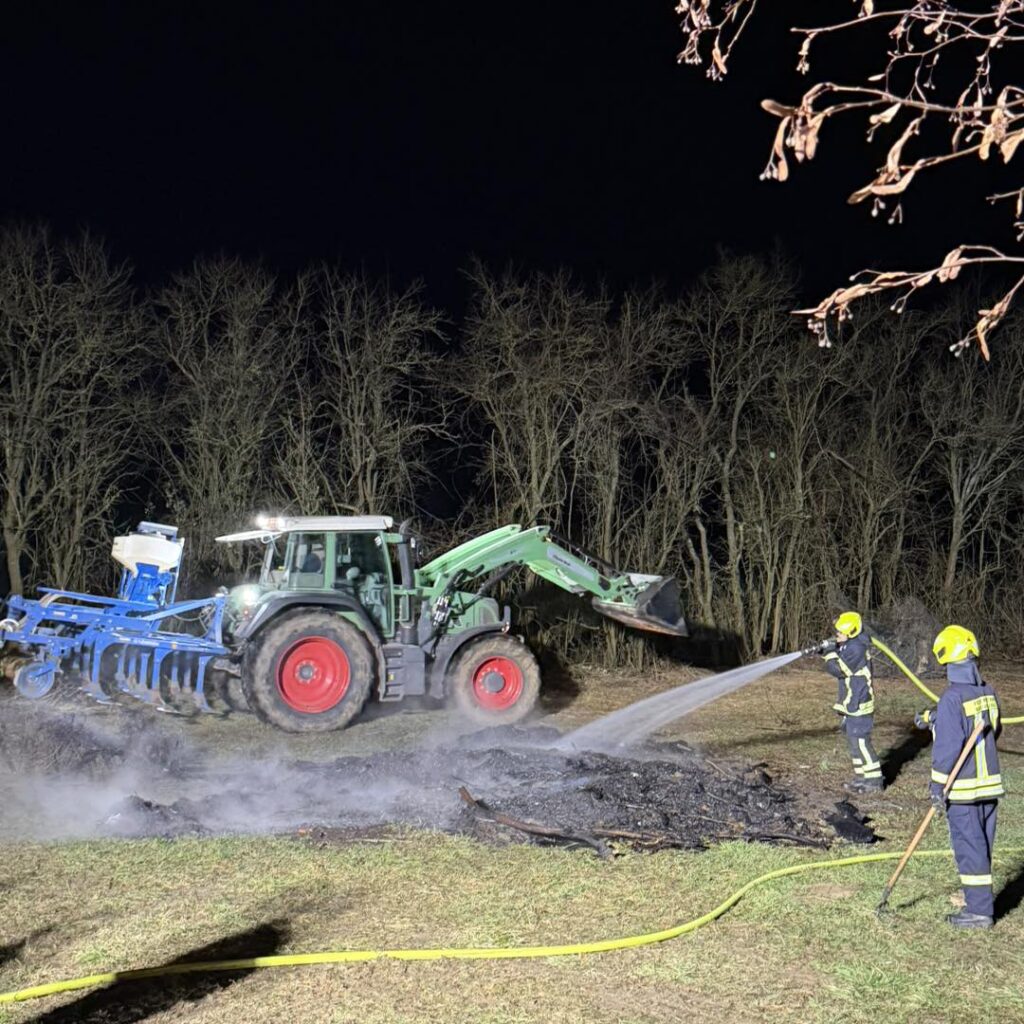 Der Haufen wurde mittels C-Rohr abgelöscht. Ein Landwirt unterstützte mit seinem Traktor, indem der Haufen auseinandergezogen wurde, damit verbliebene Glutnester vollständig abgelöscht werden konnten.